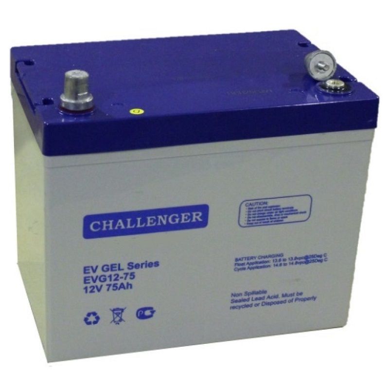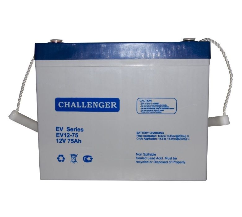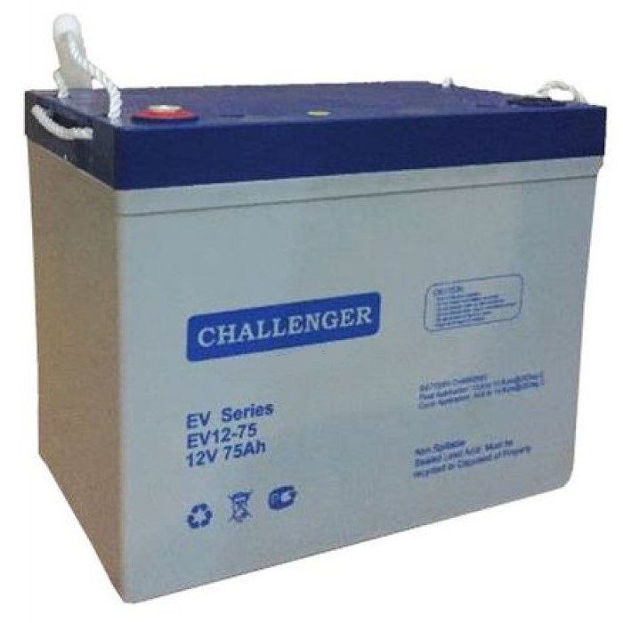 Тяговая аккумуляторная батарея 12 Вольт (12V) Challenger EV12-75 полностью необслуживаемого типа и герметизирована (VRLA). Работает по экологическому принципу без выделения газа и испарений. Сфера применения- магазины, торговые центры, больницы, складские помещения.