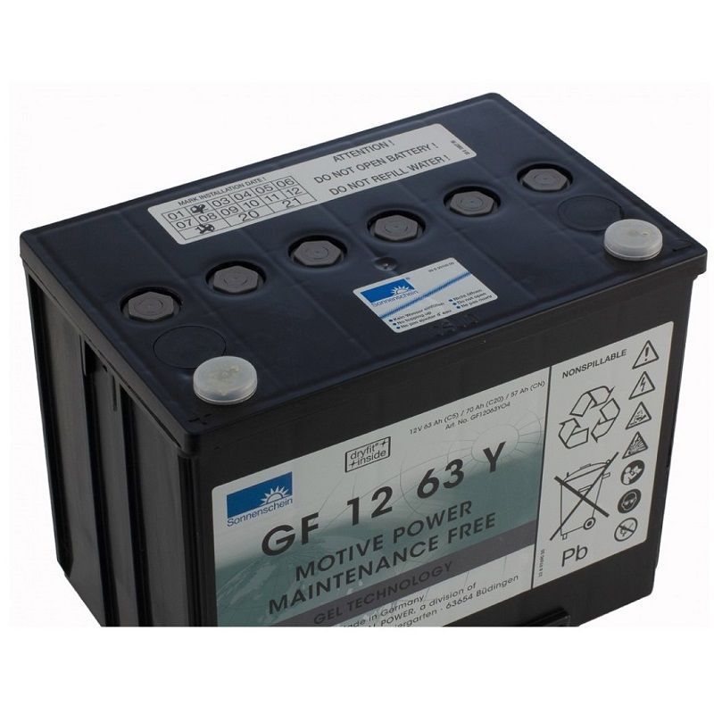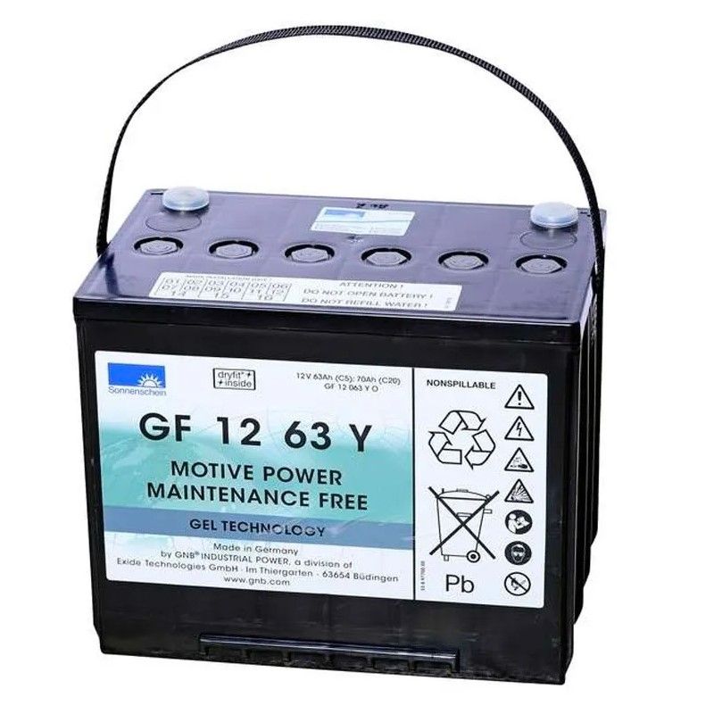 Sonnenschein GF 12 063 YO - тяговый аккумулятор ёмкость C5 63 Ач и напряжением 12 вольт разработан с применением технологии Dryfit (или GEL — электролит загущен до желеобразного состояния), что обеспечивает повышенную устойчивость к температурам и глубоким разрядам. Он применяется в электромоторах с высокими требованиями к энергоёмкости, циклической выносливости и мобильности: яхты, лодки, инвалидные коляски, уборочная и складская техника.