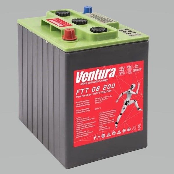 Ventura FTT 06 200 – тяговый моноблок с жидким электролитом и панцирными пластинами. Отличается ускоренным зарядом за счет низкого внутреннего сопротивления, быстрым выходом на номинальную емкость, а также весьма привлекательной стоимостью при солидном сроке службы не менее 1200 циклов заряд-разряд.