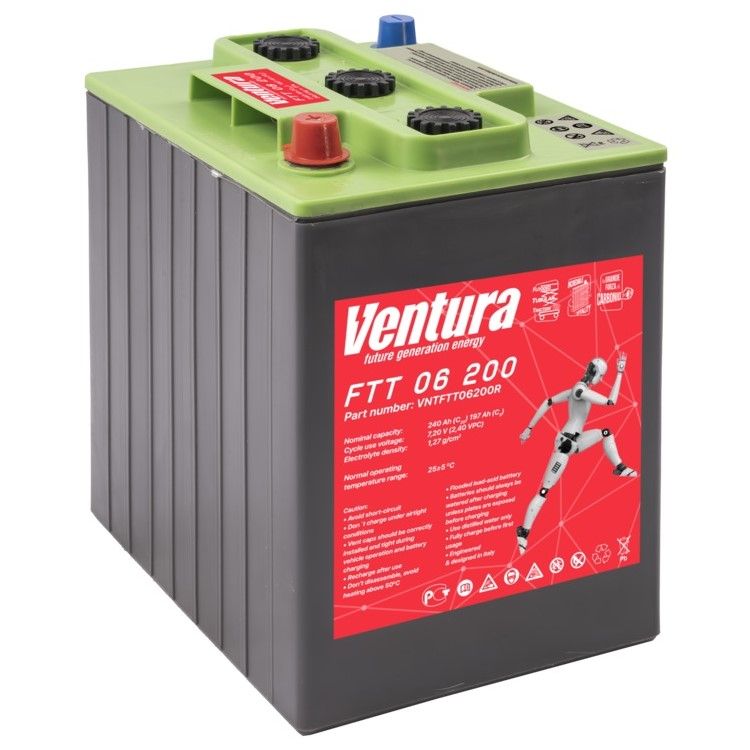Ventura FTT (Flooded Tubular Traction) – тяговые моноблоки с жидким электролитом и панцирными пластинами. Эта серия предназначена для эксплуатации в тяжелых условиях, и ее конструкция подразумевает долгий срок службы. Для Аккумуляторов серии FTT характерен низкий саморазряд при хранении и повышенная прочность и живучесть конструкции при тяжелых до экстремального режимах работы.