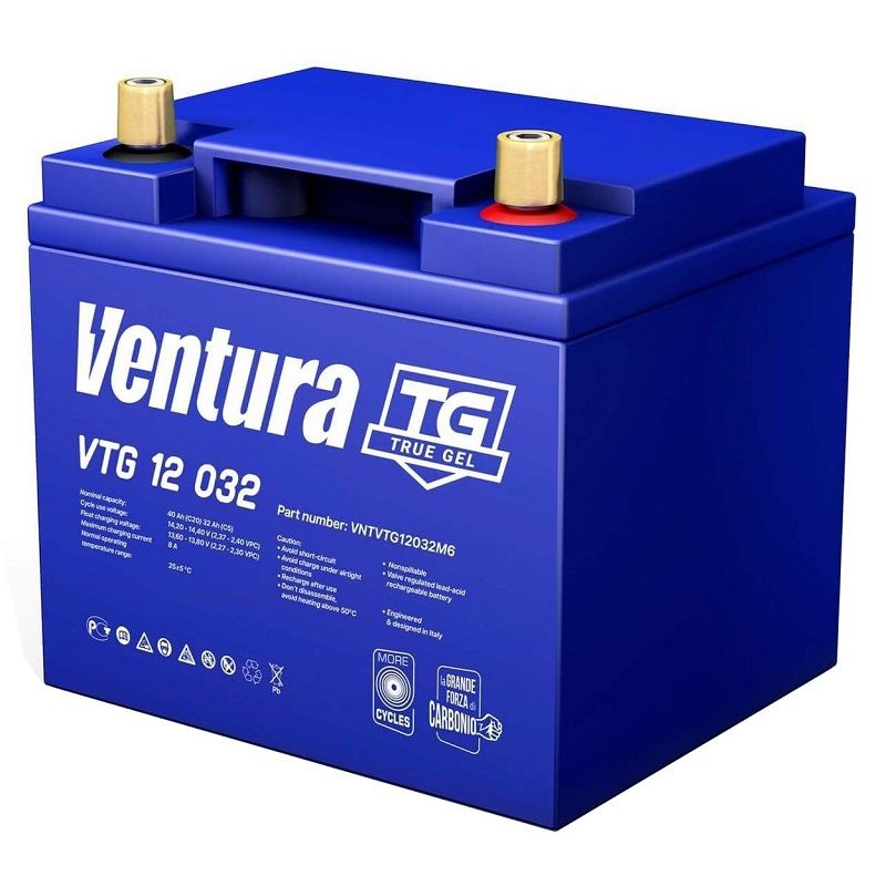 Ventura VTG 12 032 M6 – свинцово-кислотный тяговый аккумулятор напряжением 12В и ёмкостью 40Ач. Батареи адаптированы для циклического режима работы, однако при необходимости могут эксплуатироваться в режиме постоянной подзарядки. Производитель рекомендует Ventura VTG 12 032 купить для электрокаров, подъемной и складской техники, оборудования для уборки помещений, моторных лодок и катеров, других самоходных машин и механизмов на электротяге.