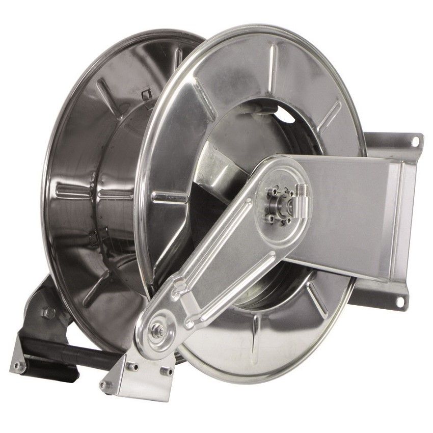 Катушка изготовлена из нержавеющей стали AISI 304, предназначена для использования в пищевой и химической промышленности, машиностроении, лабораториях и прочее. Механизм намотки шланга - инерционный или автоматический с пружинным приводом, намотка шланга на барабан происходит за счет энергии сжатой во время разматывания пружины. Самый распространенный тип привода: обеспечивает максимальное удобство работы, надежный и неприхотливый.