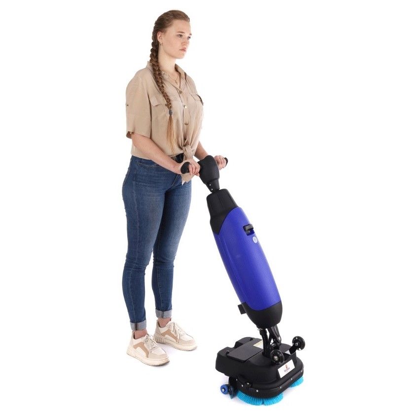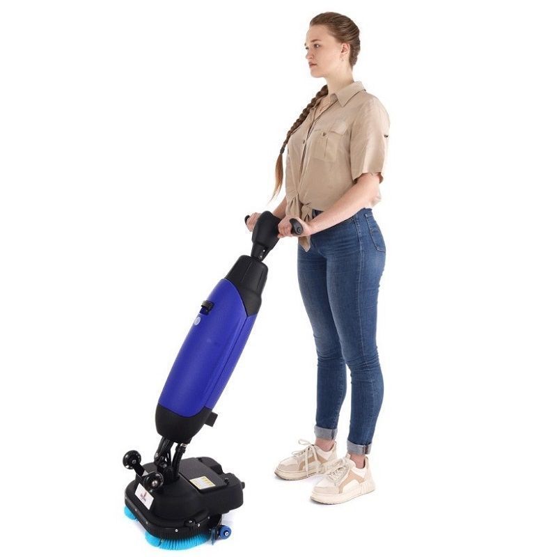 Модель обладает вертикальной формой, что облегчает процесс ее очистки и требует совсем немного места для ее хранения. Давление прижима этого агрегата превосходит обычную швабру в 8-10 раз, что позволяет добиться высокого эффекта от мойки пола. Широкая рабочая щетка позволяет за один проезд убрать большую площадь, она идеально подходит как для чистки небольших частных домов, так и для производственных помещений, ее можно использовать для чистки практически любой поверхности: линолеума, наливных полов, ПВХ-покрытий, искусственного или натурального камня.
