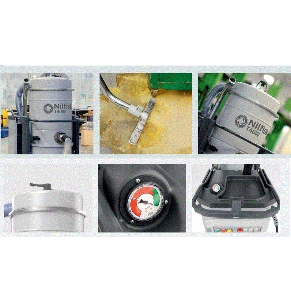 В стандартной комплектации T40W оснащен фильтром "L"-класса, а ручной фильтр-шейкер обеспечивает высокую эффективность фильтрации. Еще одним преимуществом пылесоса является его эргономичность, которая достигается благодаря наличию отсека для аксессуаров, держателей кабеля, шланга и насадки. Снижение эффективности фильтрации отображается на манометре, указывая оператору на необходимость встряхивания фильтра. Выключатель (Вкл/Выкл) расположен в боксе на заднем шасси для предотвращения от ударов.
