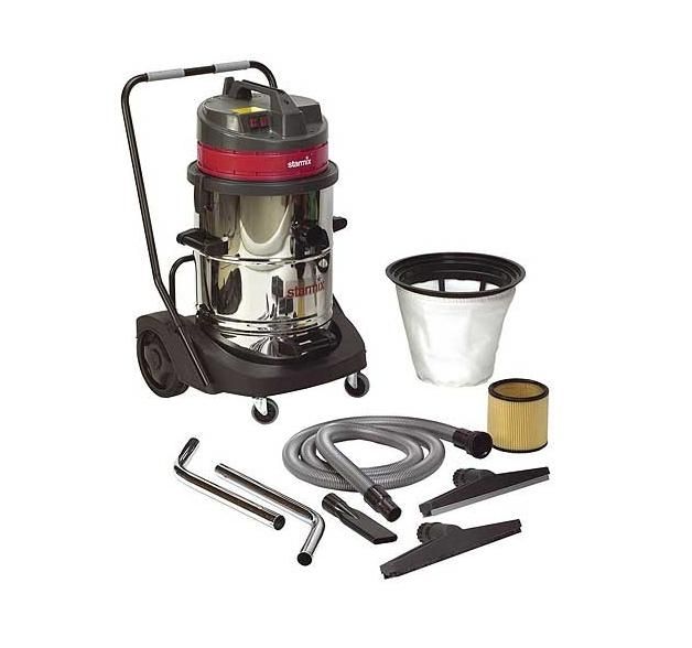 Starmix GS 3078 PZ -  это мощный и производительный универсальный пылеводосос. Благодаря своей универсальности, данный пылесос может использоваться в совершенно различных отраслях. Три мощных турбины и комплект отличных аксессуаров, позволяют пылесосу легко справиться как с сухой пылью, так и со сбором различных жидкостей. Пылесос установлен на удобной тележке, оснащенной механизмом опрокидывания бака, что делает большой пылесос удобным и легким в эксплуатации. Два фильтра (фильтр-корзина и картриджный фильтр), установленные на пылесосе позволяют собирать даже мелкую пыль, однако при сборе строительной пыли, необходимо следить за степенью загрязнения корзины, т.к. "забитый" пылью фильтр-корзина не может пропускать воздух, что может привести к выходу из строя пылесоса. Для сбора больших объемов мелкой строительной пыли необходимо использовать мешки для сбора пыли.