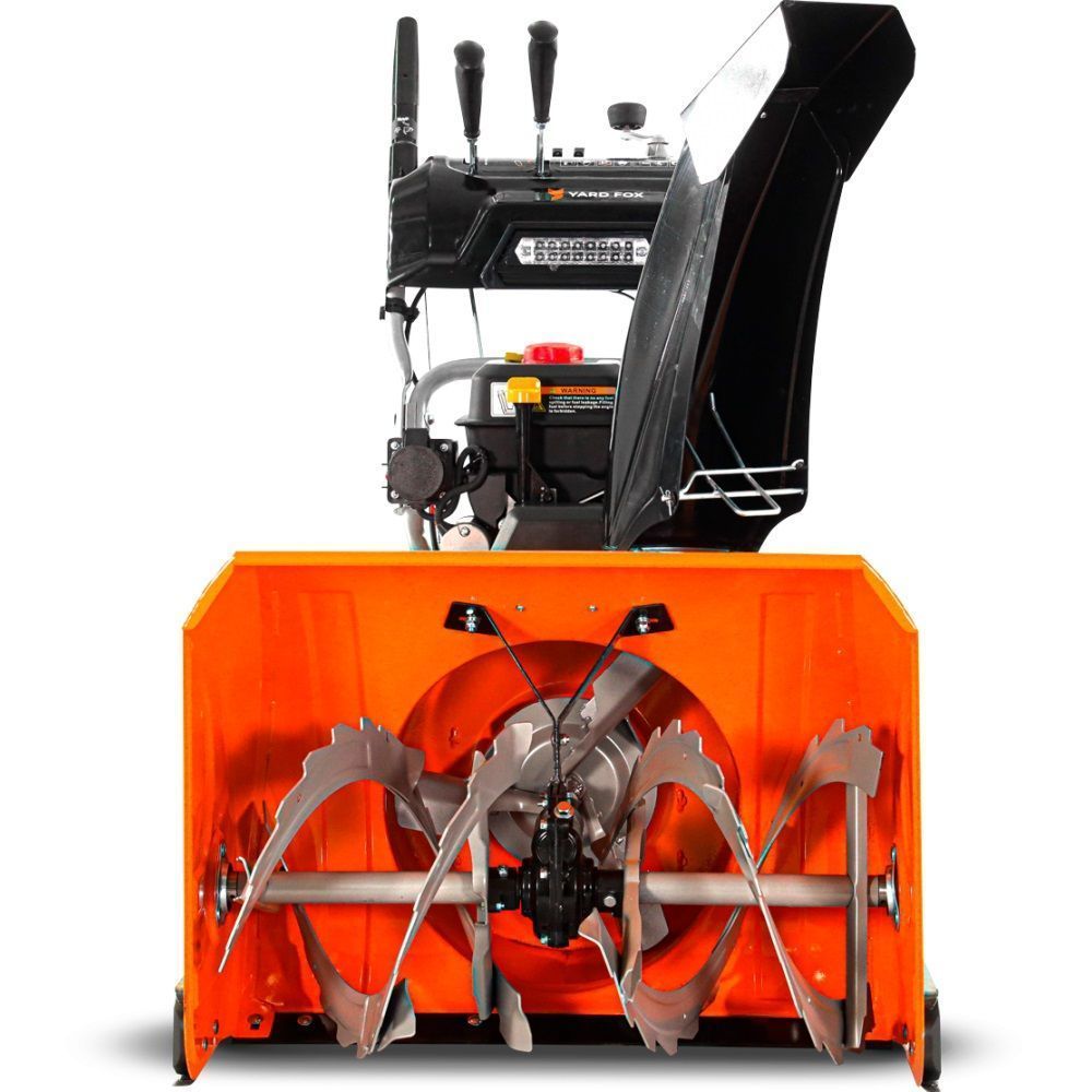 Yard Fox 7154E относится к самоходным моделям техники. Поэтому работать с ним достаточно просто. Все элементы управления машиной удобно сосредоточены на панели оператора, в том числе и рычаги регулирования направлением и дальностью выброса снега. Металлический шнек легко справляется даже со слежавшейся снежной массой. Наличие специальных лыж на ковше позволяет работать с техникой на любом декоративном покрытии. Светодиодная фара будет освещать рабочую площадку в тёмное время суток. Широкие пневматические колёса обеспечивают уверенное продвижение агрегата по рыхлому снегу и скользкой поверхности. Подогрев ручек повышает комфорт работы оператора в холодное время года.